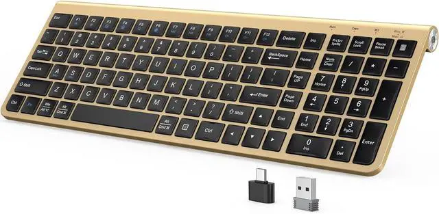 USB-A/C Receiver: This gold ergonomic wireless keyboard comes with an extra USB-C adapter for plug-and-play convenience, ensuring no connection or latency issues. Equipped with advanced 2.4GH z wireless technology, it offers a powerful and reliable connection range of up to 10 meters (33 feet). Please note that the USB-C adapter is not a standalone receiver and must be used with the USB-A receiverboth receivers are individually packaged in the box for easy access