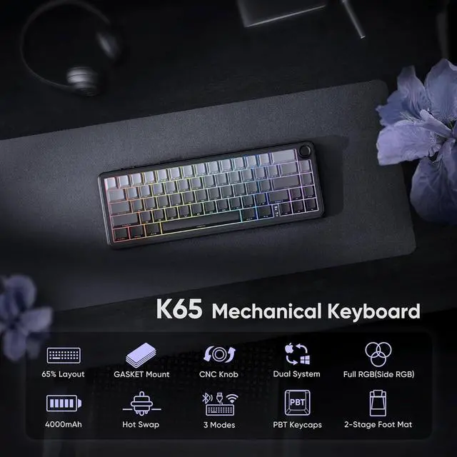 Full RGB & 4000mAh BatteryThe K65 mechanical keyboard with 1.68 million RGB colors and a rechargeable 4000mAh battery can light up diverse atmospheres. Use FN combinations, CNC knob, or software to set RGB light modes (like rhythm lights), color, speed, and brightness. FN + TAB can adjust side lighting modes. South-facing LEDs meet most keycap lighting requirements, including side-engraved ones. A charging indicator shows power needs & status, ensuring you never miss a charge for long-lasting use (opt for the original charging cable or a qualified data-capable one to charge via a computer' s USB port).