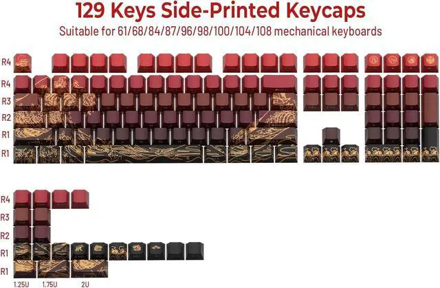 Widely CompatibleThis custom keycap set contains 129 keys. it can fit most 60%/65%/75%/80%/96%/100% (61/64/68/84/75/87/96/980/104/108) keyboards.
