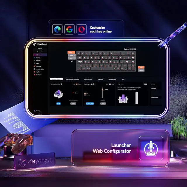 Launcher Web App: Access the Launcher web configurator from your browser to remap keys, create macros, fine-tune actuation points, and enable rapid trigger or snap action. Designed to give you full control over your Keychron K6 HE keyboard setup.