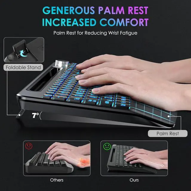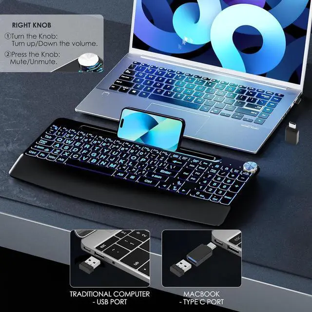Lighted up Full Size 2.4G Wireless Keyboard, Rechargeable, with 7 Colored Backlits &Phone Holder &Wrist Rest, for Mac Windows Laptop PC