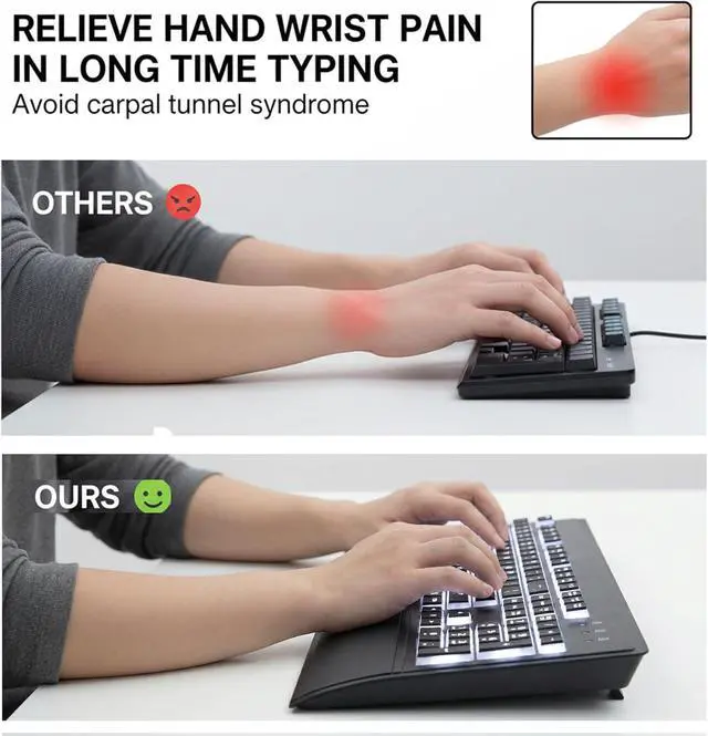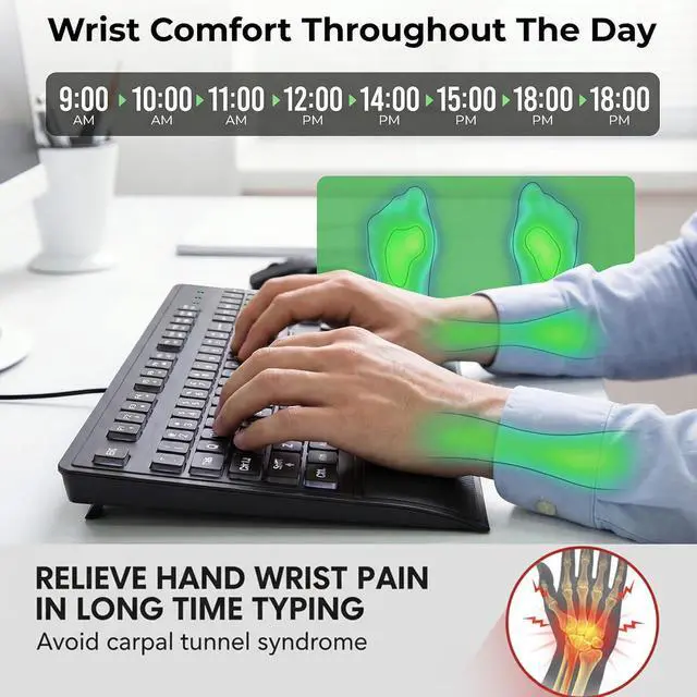 FULL SIZE KEYBOARD WITH WRIST REST: Unfold the feet at the back of the keyboard to reduce hand fatigue and enjoy long office hours. Full QWERTY English (USA) 104 key keyboard layout with numeric keypad and large print keys provides excellent comfort without the need to relearn how to type