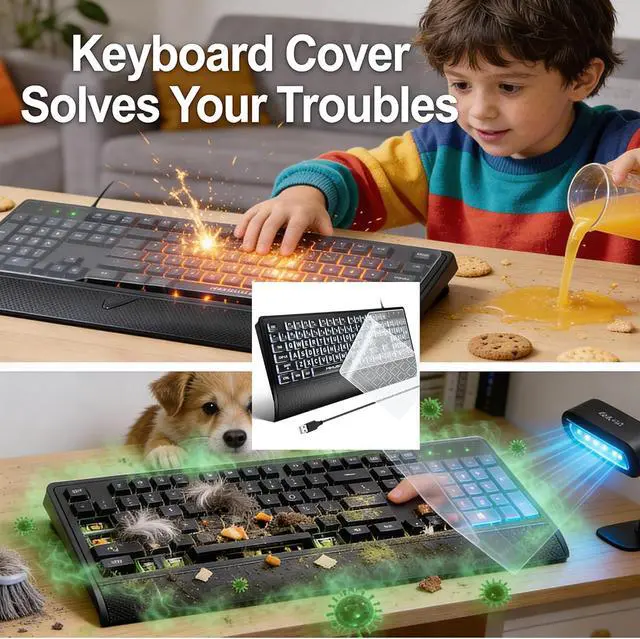 KEYBOARD WITH COVER: This black keyboard comes with a waterproof and dustproof keyboard cover, which can reduce key sound, extend key lifespan, and prevent snacks and debris from falling in and keep clean. Suitable for offices, work, and desktops