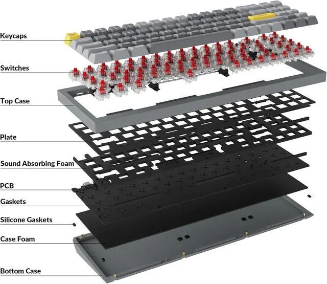 Double Gasket Design: Constructed with a CNC machined aluminum case, the keyboard incorporates a double-gasket mount design with silicone pads. This design allows the keyboard to maintain the flexibility of the gasket structure and improves the overall typing sound.