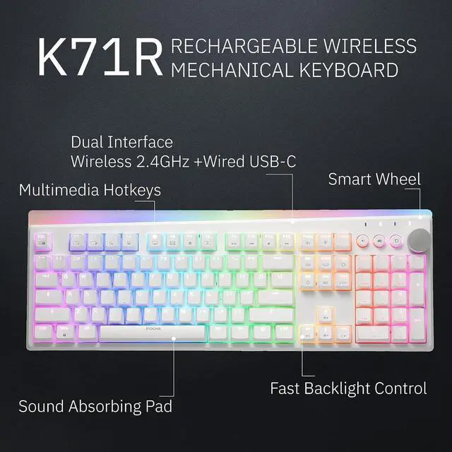 Dual InterfaceWireless 2.4GH z + Wired USB-C, Using a low latency 2.4GH z connection, gamers can enjoy a cable-free gaming experience. Simply switch to wired mode with a single pull to charge and type simultaneously. It' s a versatile choice for gamers
