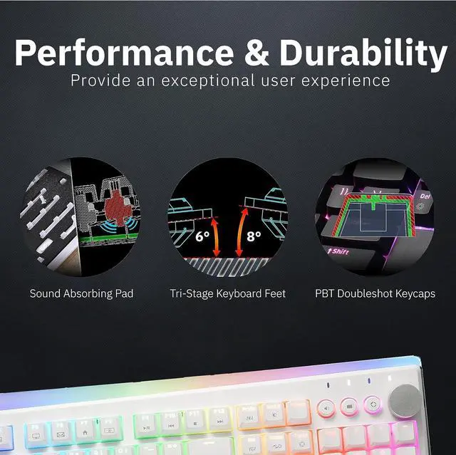 RGB switchesDeliver up to 50M click lifespan. Powered by an advanced microcontroller, it features N-key rollover and anti-ghosting for smooth and precise gaming or fast typing. Add a vibrant touch to your gaming setup with customizable RGB lighting. o ghosting and avoid having that nasty oily look overtime