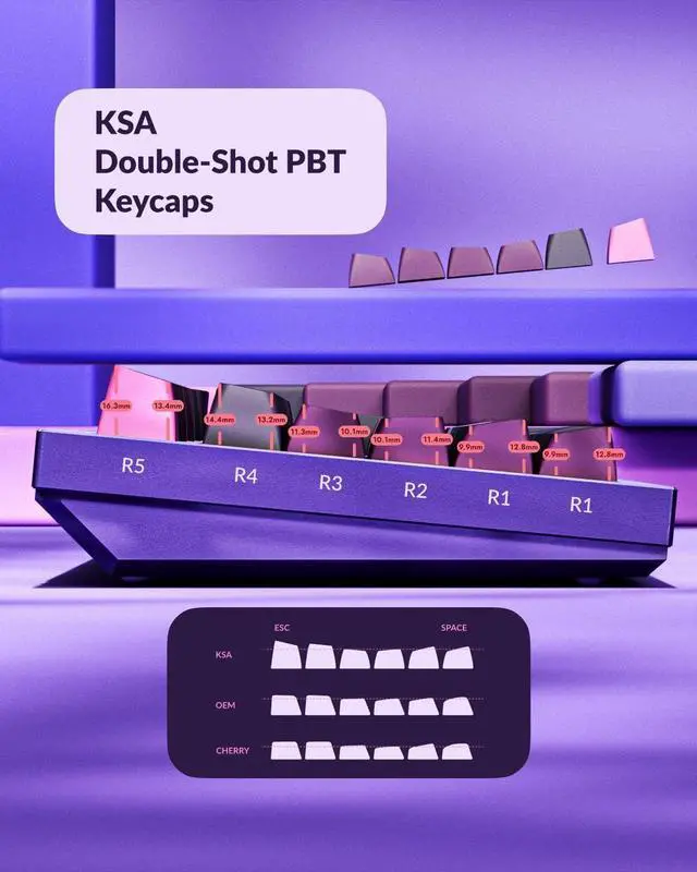 Hot-Swappable and PBT Keycaps - You can hot-swap every switch on the Q5 Pro with almost all of the 3pin and 5pin MX style mechanical switches on the market without soldering required. Our unique KSA profile double-shot non-backlight shine through PBT keycaps are oil-resistant and durable for long-term use. While the south-facing RGB backlight is made for premium non-shine through keycaps.