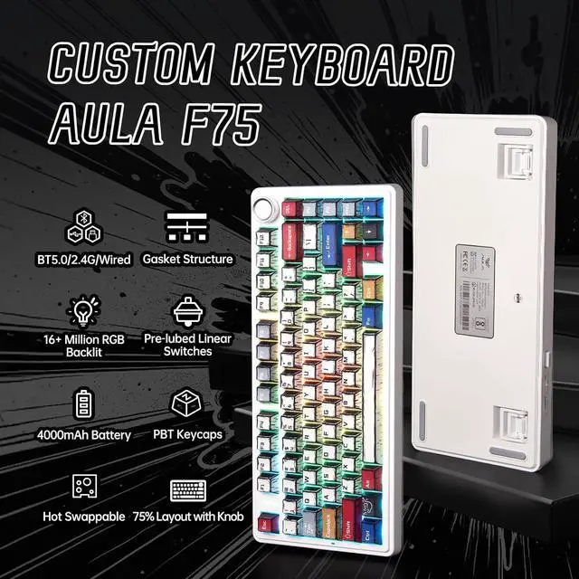 Hot-Swap Custom Keyboard: F75 gaming keyboards equipped with pre-lubricated stabilizers and LEOBOG reaper switches, brings you smooth typing feeling and pleasant creamy sound, and provides fast response for exciting game. With hot-swappable base(supports 3-pin or 5-pin switches), you can easily DIY your own keyboards without soldering issue
