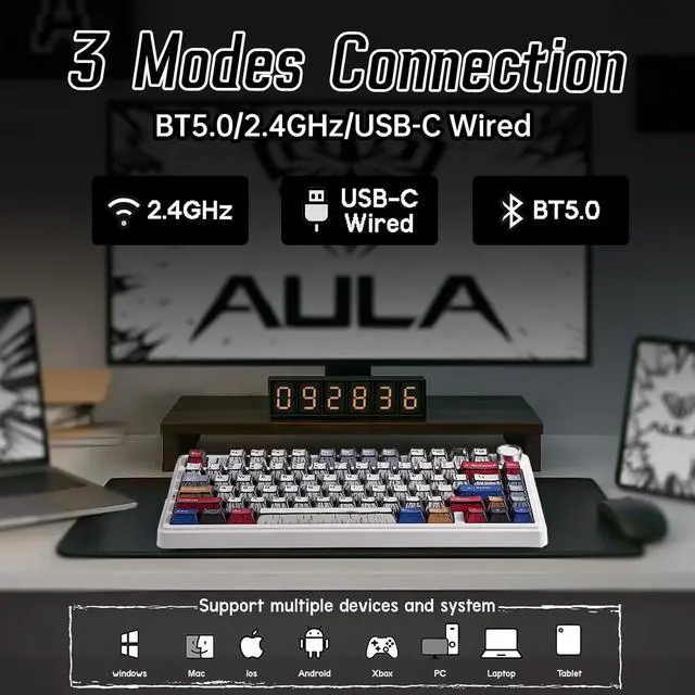 Tri-Mode Connection Keyboard: AULA F75 mechanical keyboard supports BT 5.0, 2.4GH z wireless and USB wired connection, you can connect up to 5 devices at the same time, which is suitable for PC, laptops, tablets, mobile phones, PS, XBOX etc, to meet your specific needs; With large 4000mAh battery capacity, this wireless gaming keyboard is good enough for long time work or gaming
