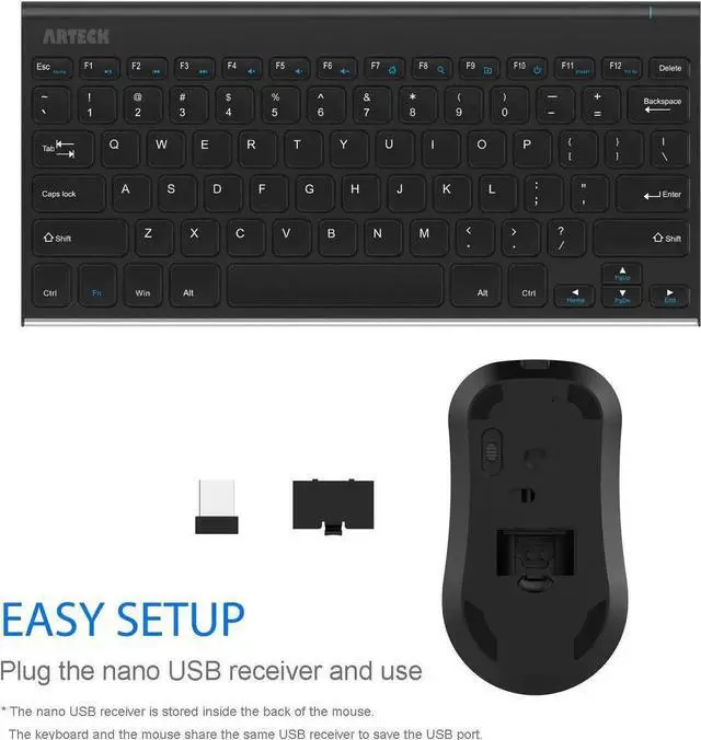 What You Get: Arteck HW086 Wireless Keyboard, MW162 Wireless Mouse, one nano USB receiver for both keyboard and mouse (stored in the back of the mouse), USB charging cable, welcome guide, our 24-months warranty and friendly customer service.