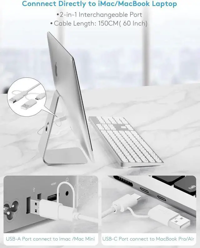 Connection Cable with USB-A/USB-C Interchangeable Port, in order to seamlessly connect to iMac, Mac Mini or MacBook Laptop, the keyboard take the design of 2-in-1 interchangeable port cable to ensure you can connect directly to iMac/Mac Mini or MacBook Laptop without extra HUB or converter.
