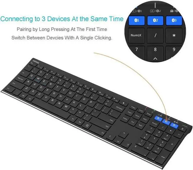 A Single Clicking: This keyboard is able to connect to 3 devices at the same time. You can switch between 3 devices with a single key clicking.