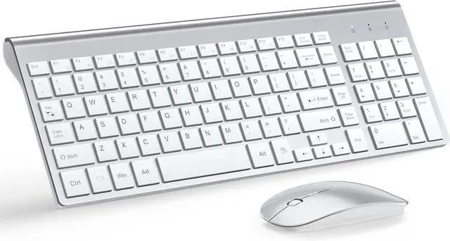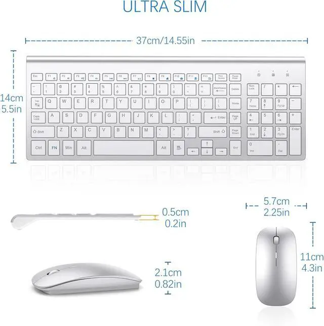 Ultra-Slim and Portable DesignWireless pc keyboard has 14.55x5.5x0.8in(37*14*2cm), 0.8in(2cm) ultra-thin ABS plastic body, which can save space and easy to carry. Kit keyboard and mouse wirelesss sleek design is super match with office desk. Perfect for business travel, office, home, library and many public occasions.