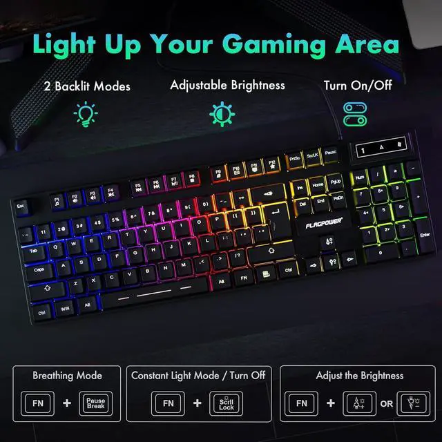 Gaming Keyboard and Mouse: 3 colors changeable backlit gaming keyboard with 3 grade adjust brightness and 2 breathing mode, 4 colors circular breathing led gaming mouse, 4 adjustable DPI (1200, 1600, 2400, 3200). There are manually permanent lighting mode, automatically/manually breathing mode. Pressing Fn and could get brightness increasing/decreasing. (The backlight will be closed after pressingFn andthree times.)