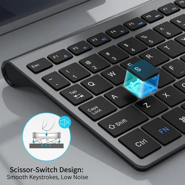 Quiet Click and Scissor- Switch:This bluetooth keyboard uses noise reduction technology to greatly reduce the sound of keystrokes. The Scissor-switch thin and light keys can relieve the fatigue on your wrist or fingers. At the same time, it can ensure a quiet and pleasing work environment.