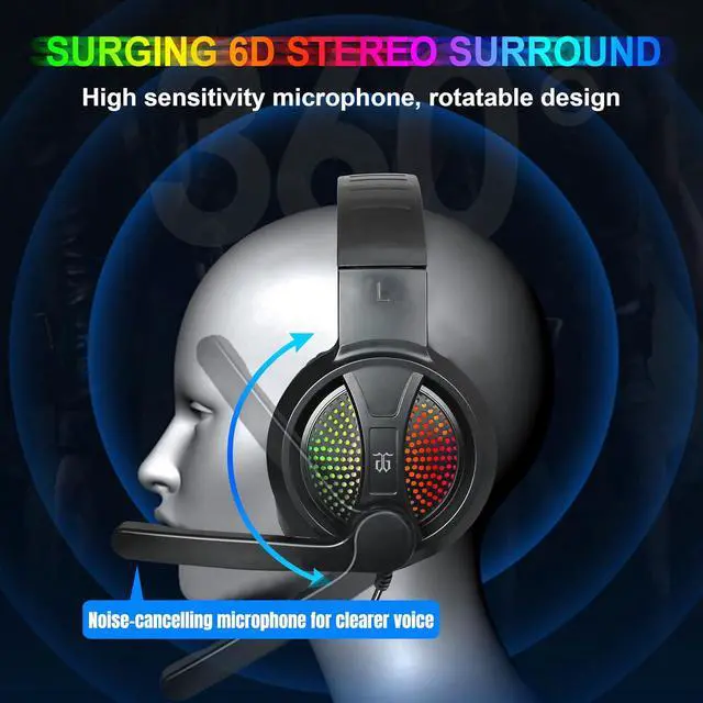 Lightweight Gaming Headset with Microphone Rgb beam,high imitation protein earpad,40mm driver and high definition microphone that will give you best sound quality, strong noise isolation.Retractable headband design with synthetic leather-wrapped ear-cushions allows you to play for hours in complete comfort