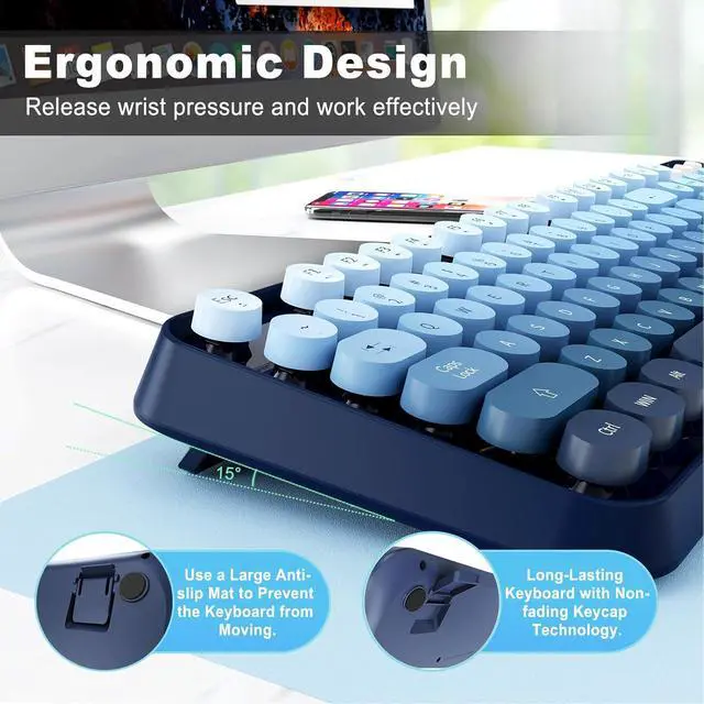 FOPETT Wireless Keyboard and Mouse Combo - 2.4G Full-Sized Cute Colorful Mouse and Keyboard with 104 Round Keys Retro Typewriter Keyboard for Laptop/Windows/PC - Blue Gradient