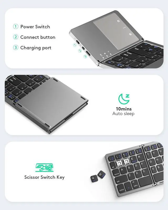 Sensitive Touchpad Foldable KeyboardUpgrade sensitive touchpad supports multi-touch, so you can control the device without using mouse. More convenient and efficient! (NOTE: IOS 13.4 and below or Android 3.0 and below are not supported!!!) Built-in rechargeable battery can last for 48 hours or 560 hours after 2-3 hours of charging. One full charge last enough for your short business trip or vacation!