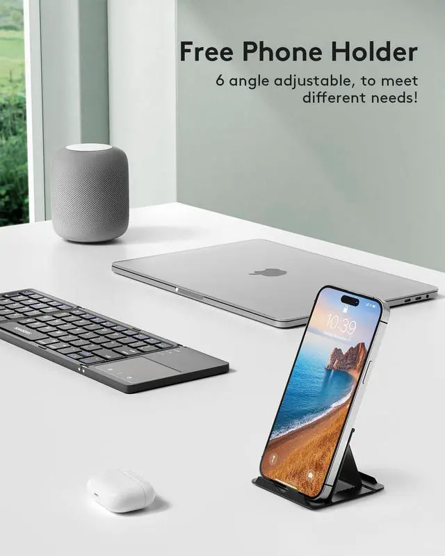 Folding Bluetooth Keyboard & Phone Stand HolderExtremely thin design of the portable folding keyboard allows you to fold it up and put it in your pocket or bag without taking up too much space. The Phone stand holder, best companion for folding keyboard, gives you perfect screen angle. Near-standard size design provides accurate, fast typing, just like the desktop keyboard you are used to. Quiet keys allow you to focus on your work. Perfect gift for travel and business trips!