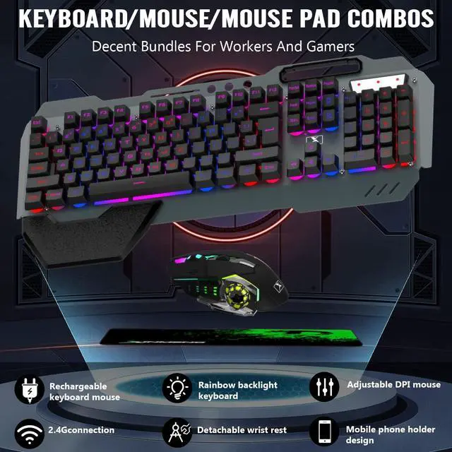 Wireless Gaming Keyboard and Mouse Combo,Rainbow LED Backlit Keyboard with Rechargeable 3800mAh Battery Metal Panel,Removable Wrist Rest Mechanical Feel and 7 Color Mute Gaming Mice for PC PS4 PS5