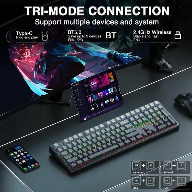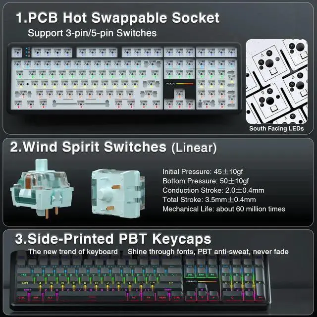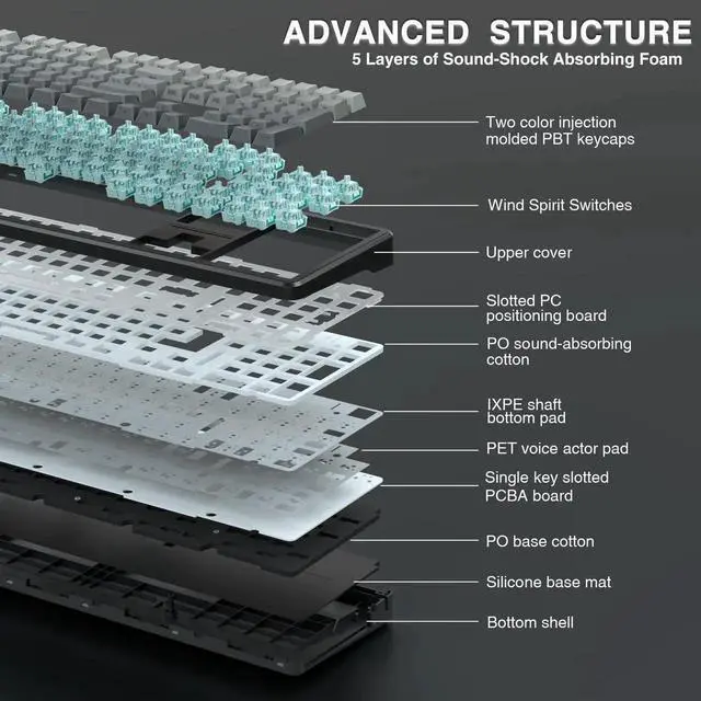 Additional Features- Advanced Five Layers Filling Structure: The mechanical keyboard wireless features an advanced structure, extended integrated silicone pad and PCB single key slotting, better optimizes resilience and stability, making the hand feel softer and more elastic. Five layers of filling silencer fills the gap between the PCB, the positioning plate and the shaft, effectively counteracting the cavity noise sound of the shaft hitting the positioning plate, ensuring the purest sound and soft and smooth typing experience every time you press the key
