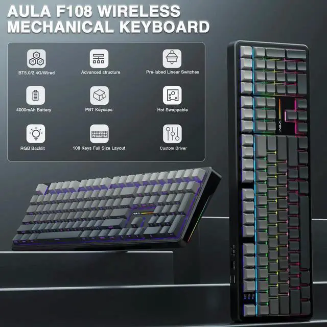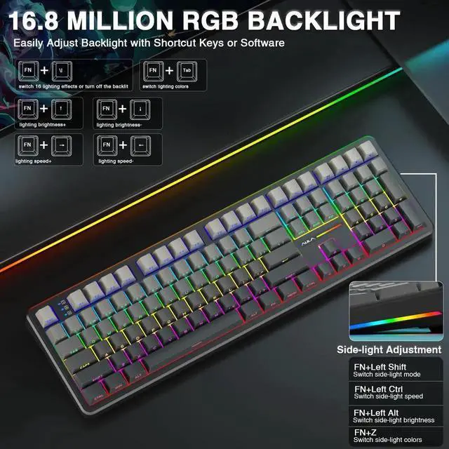 - RGB Backlight & Programmable Software: The rgb backlit keyboard supports multiple dynamic RGB effects, monochrome and multi-colour modes. Over 16.8 million RGB colors are available to suit your mood, occasion or overall aesthetic. The decorative light bars on both sides are colorful and add a strong gaming atmosphere. RGB effects and colors can be switched through the shortcut keys or software. With the F108 driver, all keys support macro customization, which allows to record and edit macros to improve your work efficiency and speed up gameplay. (Note:The driver only supports windows system in wired mode).Driver download: bit.ly/m/AULA