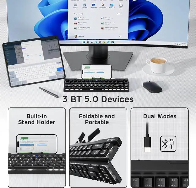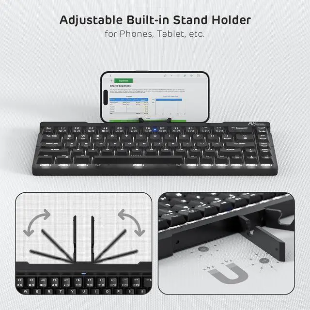 Built-in Stand Holder - Conveniently adjusts to provide the perfect screen angle for iPads, tablets, and phones. Plus, the holder can magnetically attach to the foldable keyboard.
