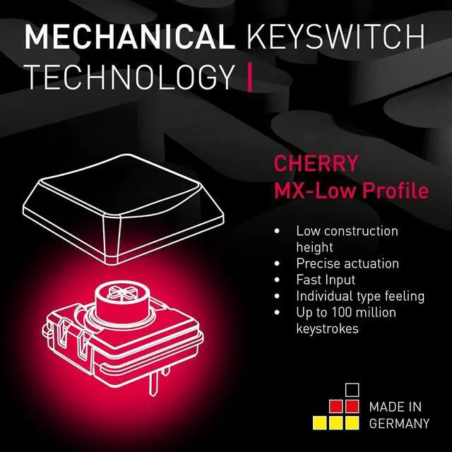 Wireless 3-mode gaming keyboard with cutting-edge CHERRY MX-LP switches CHERRY Advanced Wireless Technology 2.4GHz mode -latency of less than 1ms for ultimate gaming performance Bluetooth 5.2 mode -supports three channels for easy switching between multiple devices such as a PC, tablet or smartphone