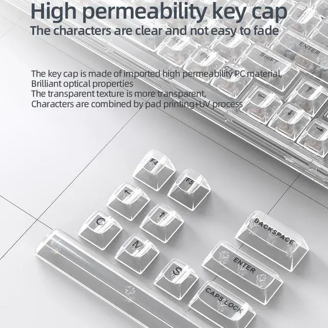The key cap is made of imported high permeability RCmaterialBrilliant optical propertiesThe transparent texture is more transparent,Characters are combined by pad printing+bV process