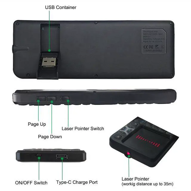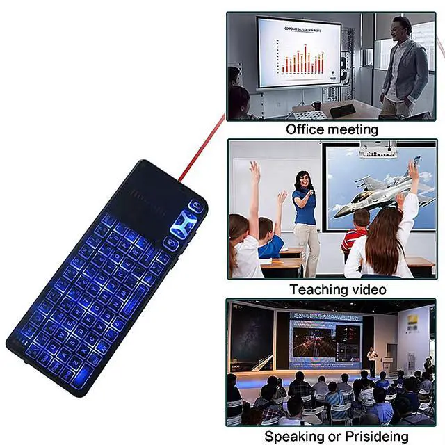 This is a product with mouse, keyboard, remote control and laser pointer function. It can use for your PC, Smart TV, Set top box, Projector and so on. With 10m wireless operation distance, it can help you get rid of staying close to the PC or TV when you operate them, you can lay on sofa or bed to operate the TV and enjoy it. Its laser pointer working distance also reach 35m