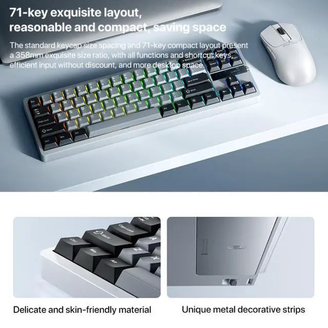 1. Adopting a 71-key exquisite layout, the function shortcut keys are all available, which is reasonable, compact and space-saving, and the desktop space is more sufficient.