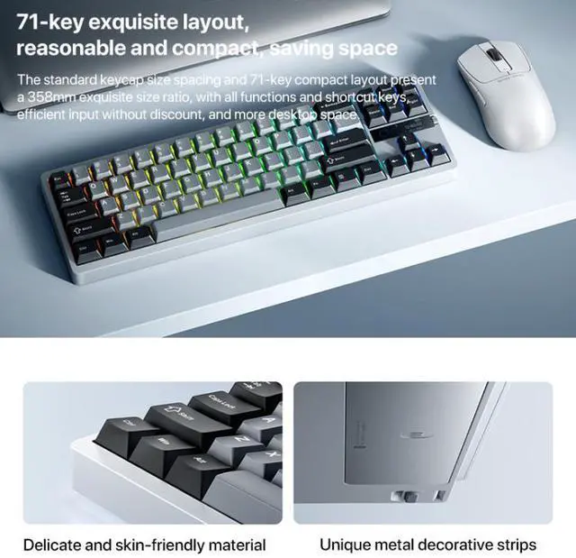 1. Adopting a 71-key exquisite layout, the function shortcut keys are all available, which is reasonable, compact and space-saving, and the desktop space is more sufficient.