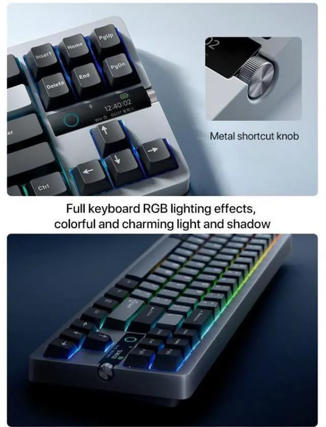 6. The small LCD display clearly displays the connection status, time and other information, intuitively selects the keyboard lighting effect, and sets the favorite picture at will, adding fun to boring work.
