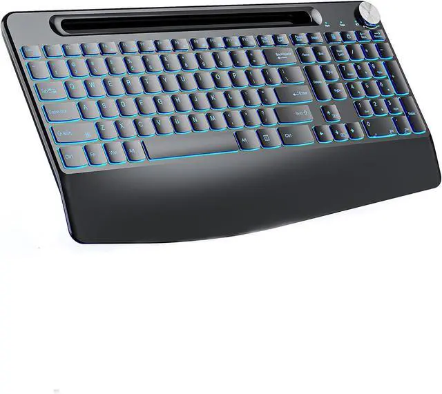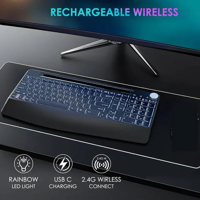 JOMAA 2.4G Wireless Silent Keyboard, Rechargeable,with 7 Colored Backlits &Phone Holder &Wrist Rest,Lighted up Full Size Keyboard for Mac Windows Laptop PC
