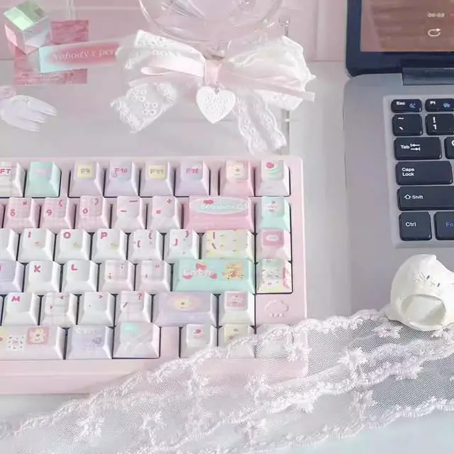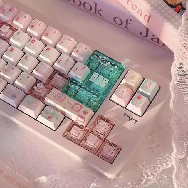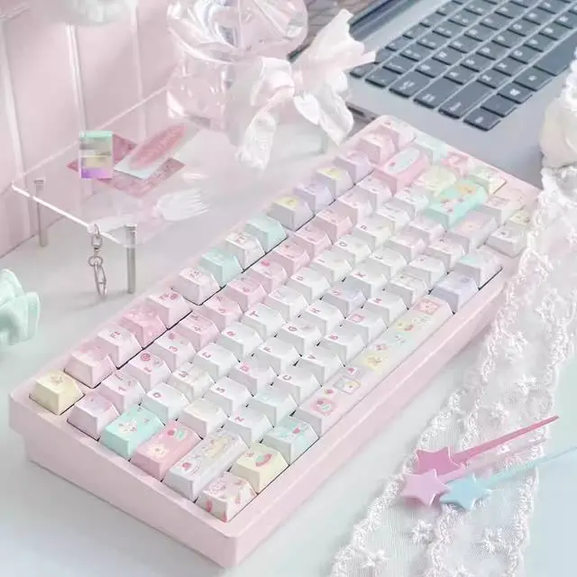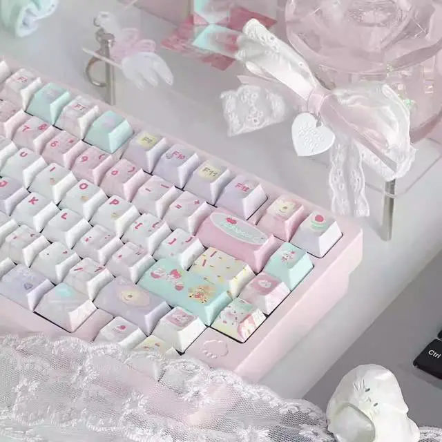 A cloud house - patchwork meow meow new / soa high-profile keycaps featuring pink girl heart color and green patchwork elements (Only keycaps)