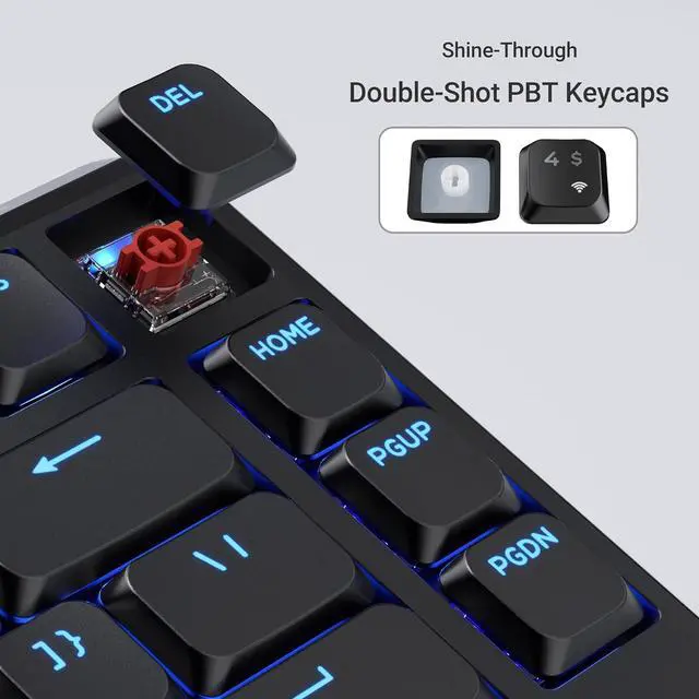 Doubleshot Low Profile PBT Shine-Through Keycaps: With a 1.3 mm actuationabout 35% faster than standard switchesit offers smooth, precise travel and lasts up to 50 million keypresses. Comes with more than 22 types of RGB backlight settings (as well as a static white backlight option).