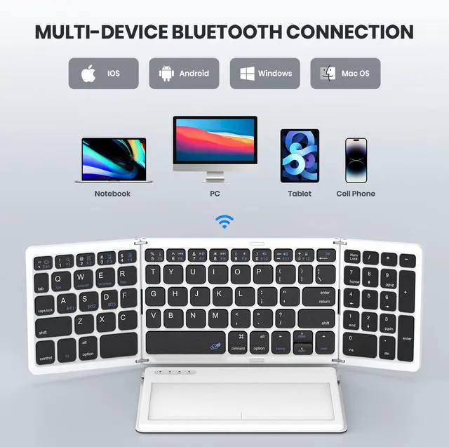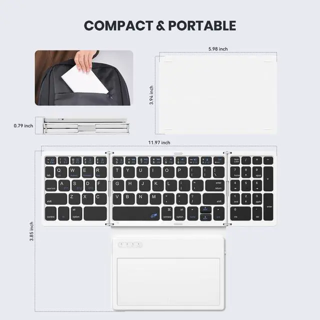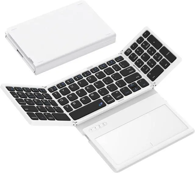 Triple-Folding Portable Bluetooth KeyboardFold it in slide into your work bag or simply stash in your carry-on for business trips. Wherever work takes you, enjoy familiar desktop-style typing on bluetooth keyboard with number pad and a touchpad surface 20% larger than previous models(FN+Space to turn off/on touchpad). Navigate screens and multitask efficiently without packing a separate mouse
