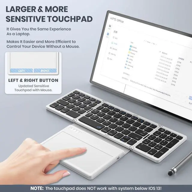 Compatible & StableUniversal compatibility with iOS, Android and Windows means this portable keyboard works seamlessly with all your must-have devices. Three Bluetooth channels allow you to connect and instantly switch between up to 3 devices at the tap of a hotkey. effective connection distance of 33 feet, providing ultra-stable, ultra-low latency wireless connectivity. Your bluetooth keyboard will automatically remember and reconnect to the last devices used when powered on, simplifying your workflow across systems and screens (NOTE: The touchpad does NOT work with system below iOS 13 )