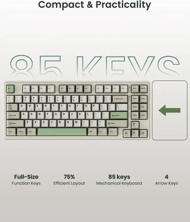 Less Keys, More DeskCrafted for users who value style and functionality, the KN85 series is a game-changer in both aesthetics and performance. As a 75% layout keyboard with 85 keys, it retains essential keys (F1-F12, arrow keys, shortcuts) while omitting the dedicated right-side number pad to keeping its compact form. Ideal for small desks, laptop setups, or anyone looking to maximize desk space efficiency.