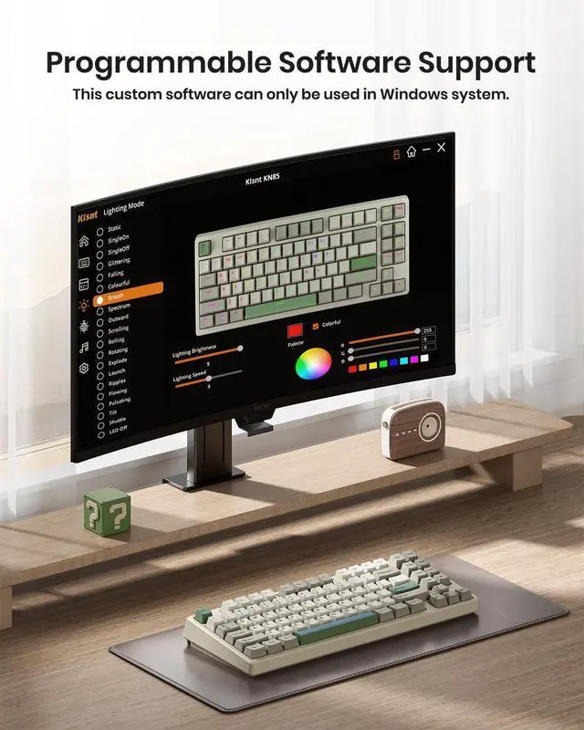 RGB Backlighting& ProgrammableThe Bluetooth keyboard has 20 pre-set dynamic effects with adjustable colors and brightness. RGB backlights shine around the PBT keycaps and edges to create the glowing effect, they can be switched through the software or shortcut keys. Also you can use `Fn + ` to dim or turn it off when not needed to extend battery life. Via the KN85 driver, all keys support macro customization, allows you to record and edit macros to improve your work efficiency and gaming competitiveness .(Note:The driver only supports windows system in wired/2.4G mode.)
