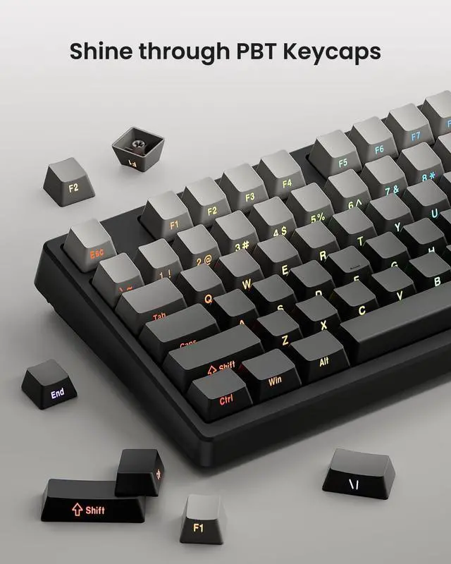 RGB Backlighting& ProgrammableThe Bluetooth keyboard has 20 pre-set dynamic effects with adjustable colors and brightness. RGB backlights shine around the PBT keycaps and edges to create the glowing effect, they can be switched through the software or shortcut keys. Also you can use `Fn + ` to dim or turn it off when not needed to extend battery life. Via the KN85 driver, all keys support macro customization, allows you to record and edit macros to improve your work efficiency and gaming competitiveness .(Note:The driver only supports windows system in wired/2.4G mode.)