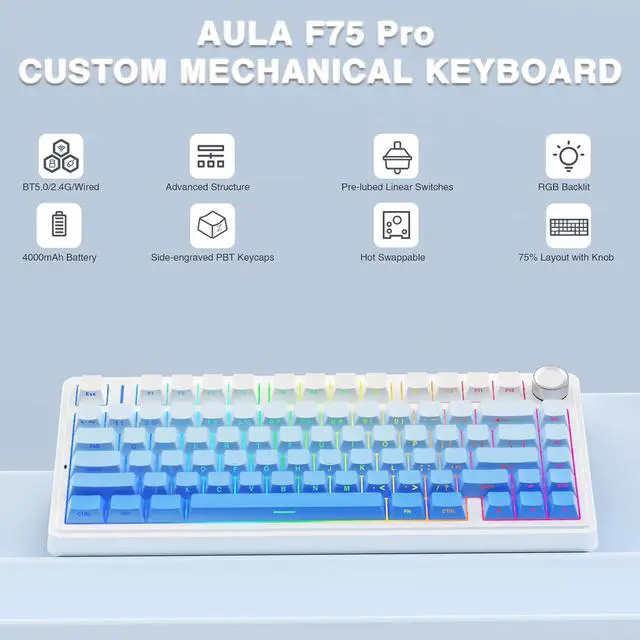 AULA F75 Pro Wireless Mechanical Keyboard,75% Hot Swappable Custom Keyboard,RGB Backlit,Pre-lubed Linear Switches,Side Printed PBT Keycaps Mechanical Gaming Keyboards,Gradient Blue