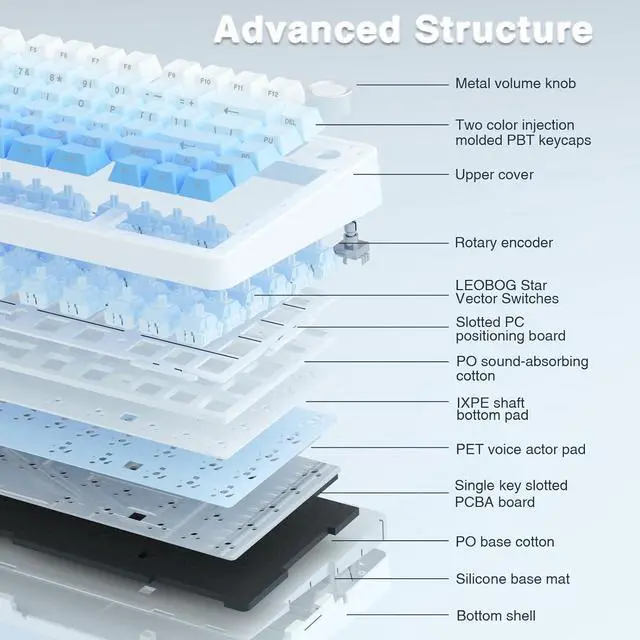 Hot-swap Custom Keyboard: This custom mechanical keyboard with hot-swappable base supports 3-pin or 5-pin switches replacement. Even keyboard beginners can easily DIY there own keyboards without soldering issue. F75 Pro gaming keyboards equipped with pre-lubricated stabilizers and LEOBOG reaper switches, bring smooth typing feeling and pleasant creamy mechanical sound, provide fast response for exciting game