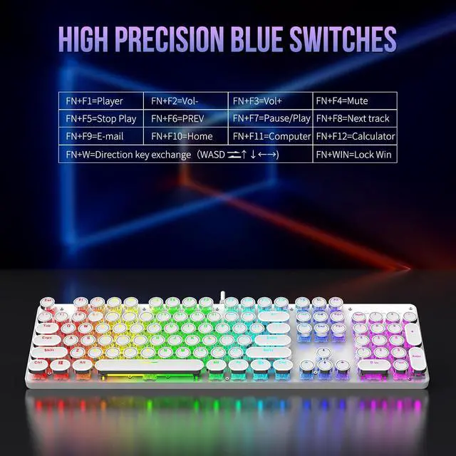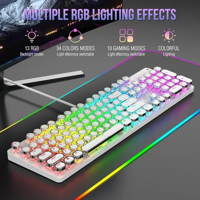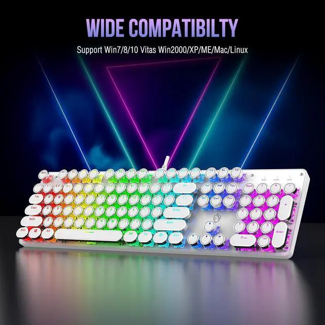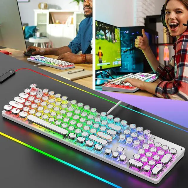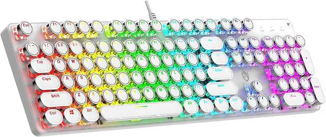 Typewriter Mechanical Gaming Keyboard with RGB Backlit Red Switches, 104 Keys Retro Round Keycap, Wired Typewriter Style Comfortable Typing Soud (R-White)