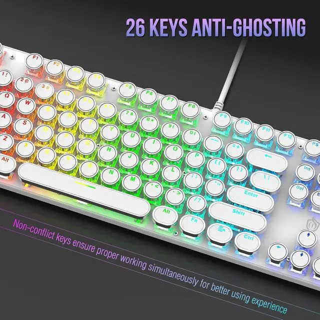 • Vintage Typewriter-Inspired Design This mechanical keyboard features a unique round keycap design inspired by classic typewriters, offering a nostalgic feel with a modern twist. The ergonomic layout provides a comfortable typing experience, perfect for both work and play.