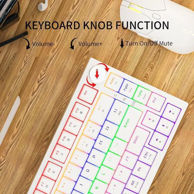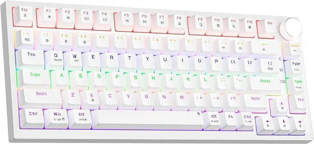 [Multi-Function Knob and Indicators] A multi-function knob in the upper right corner of the 75% percent keyboard enables you to adjust the sound level for fast, seamless and easy-to-use operation. Three indicator lights on the 75 percent keyboard give you a quicker overview of the tkl mechanical keyboard' s status. The indicators from top to bottom refer to: Caps lock, Win lock, and Windows/Mac switch.