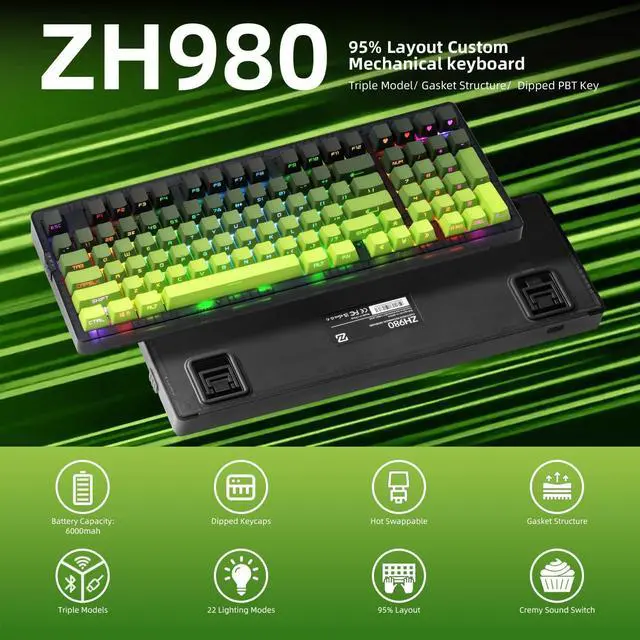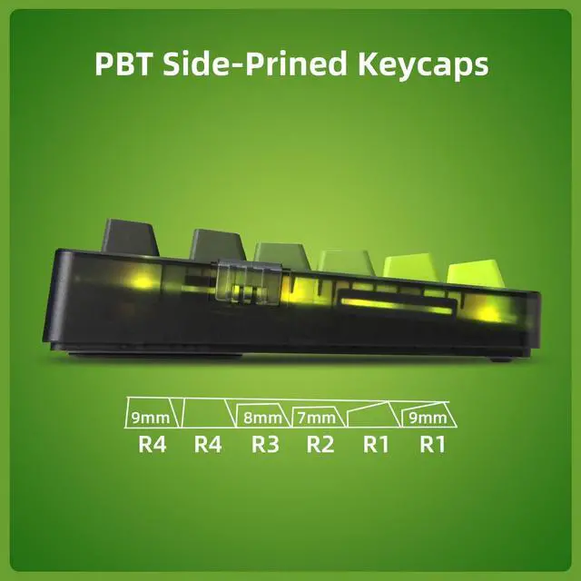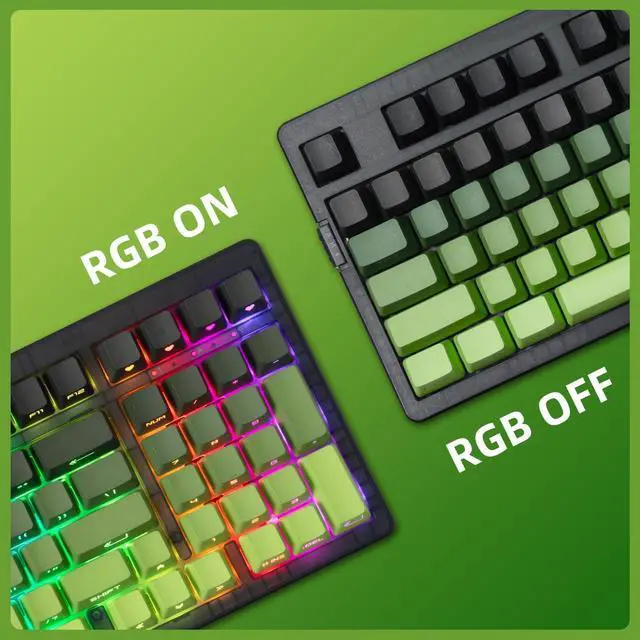 Dipped PBT Keycaps with Clear LegendsCrafted from high-purity PBT with Dipped technology, the keycaps resist shine and wear while featuring a green gradient theme that glows with RGB. Side-printed, molded legends ensure long-term clarity and smooth light diffusion.