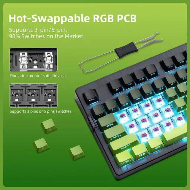 Hot-Swappable & Full Customization SupportCustomize your typing feel easilyno soldering needed. The PCB supports 3-pin and 5-pin mechanical switches. With driver software, remap keys, create macros, and tailor RGB effects to match your personal style.