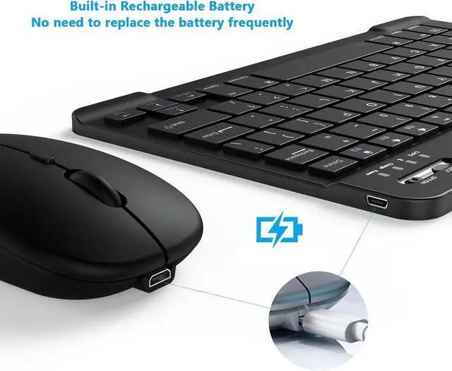 Rechargeable Battery: The Bluetooth keyboard and mouse have a built-in rechargeable battery, so there is no need to replace the battery frequently, you can use the included Type-C cable for charging. It will enter sleep mode after about 10 minutes of inactivity to save power, you can press any key to activate it and wait for 3 seconds to use it again. If not used for a long time, you can turn off the keyboard and mouse power.