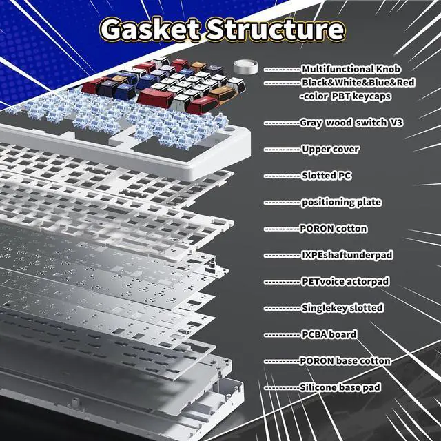 RGB Backlit Wireless Keyboard: This computer keyboard wireless features a gasket structure, extended integrated silicone pad, and PCB single key slotting, better optimizes resilience and stability, making the hand feel softer and more elastic. Lighting brightness and speed can be adjusted by the knob or the FN+key combination. Five layers of filling silencer fills the gap between the PCB, the positioning plate and the shaft, effectively counteracting the cavity noise sound of the shaft hitting the positioning plate.